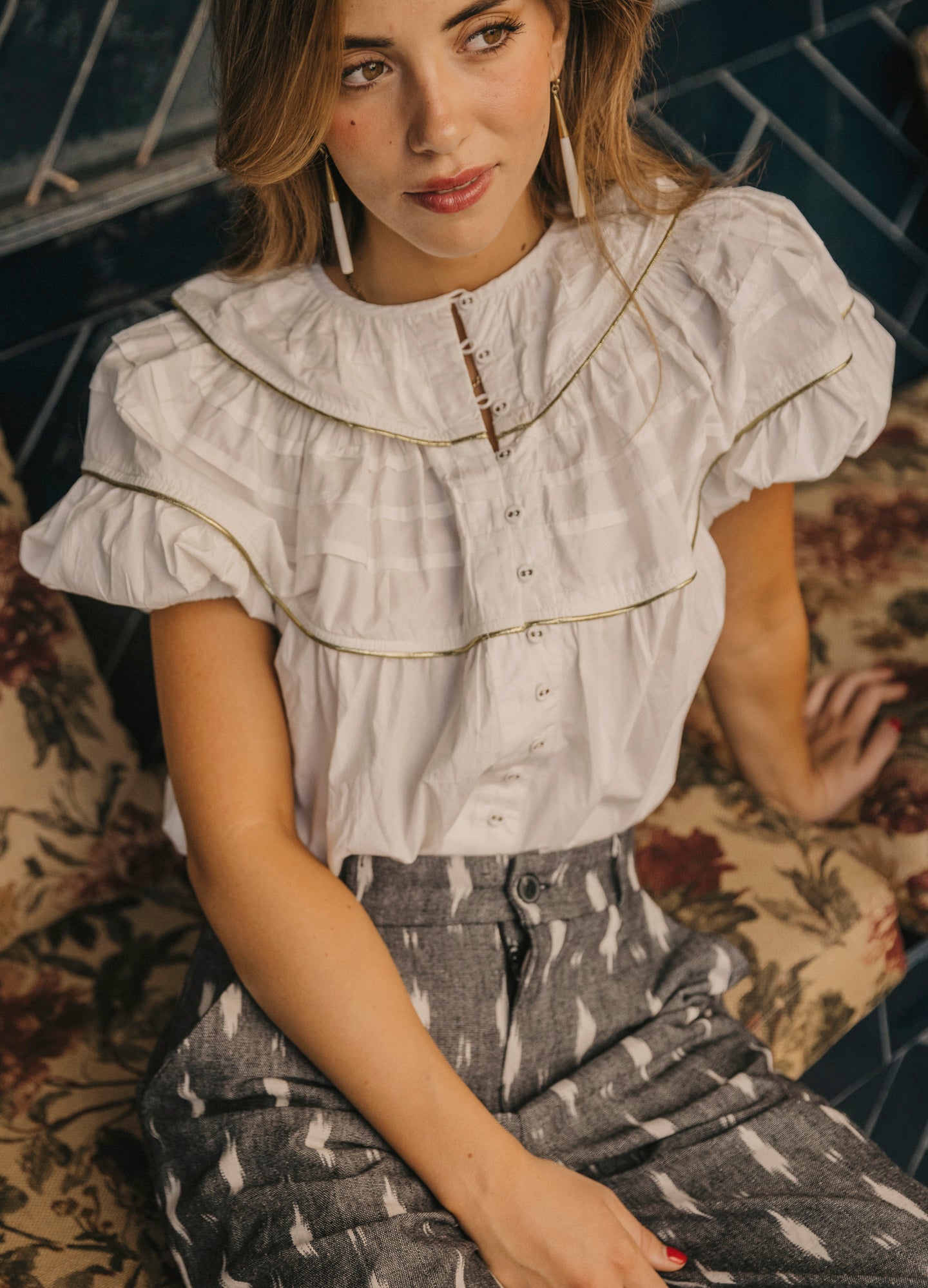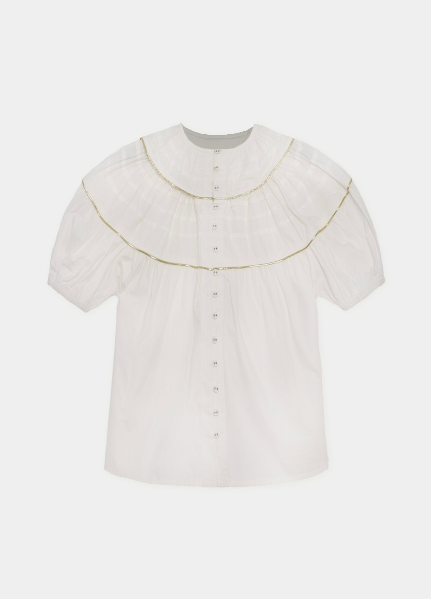 Short-sleeved raglan blouse with a crew neckline. A round neckline decorated with gathers and a ruffle simulating a collar, plus a shiny gold trim detail at the front of the sleeve. Center closure with tabs and buttons covered in the same fabric. Elastic cuffs for added comfort.
