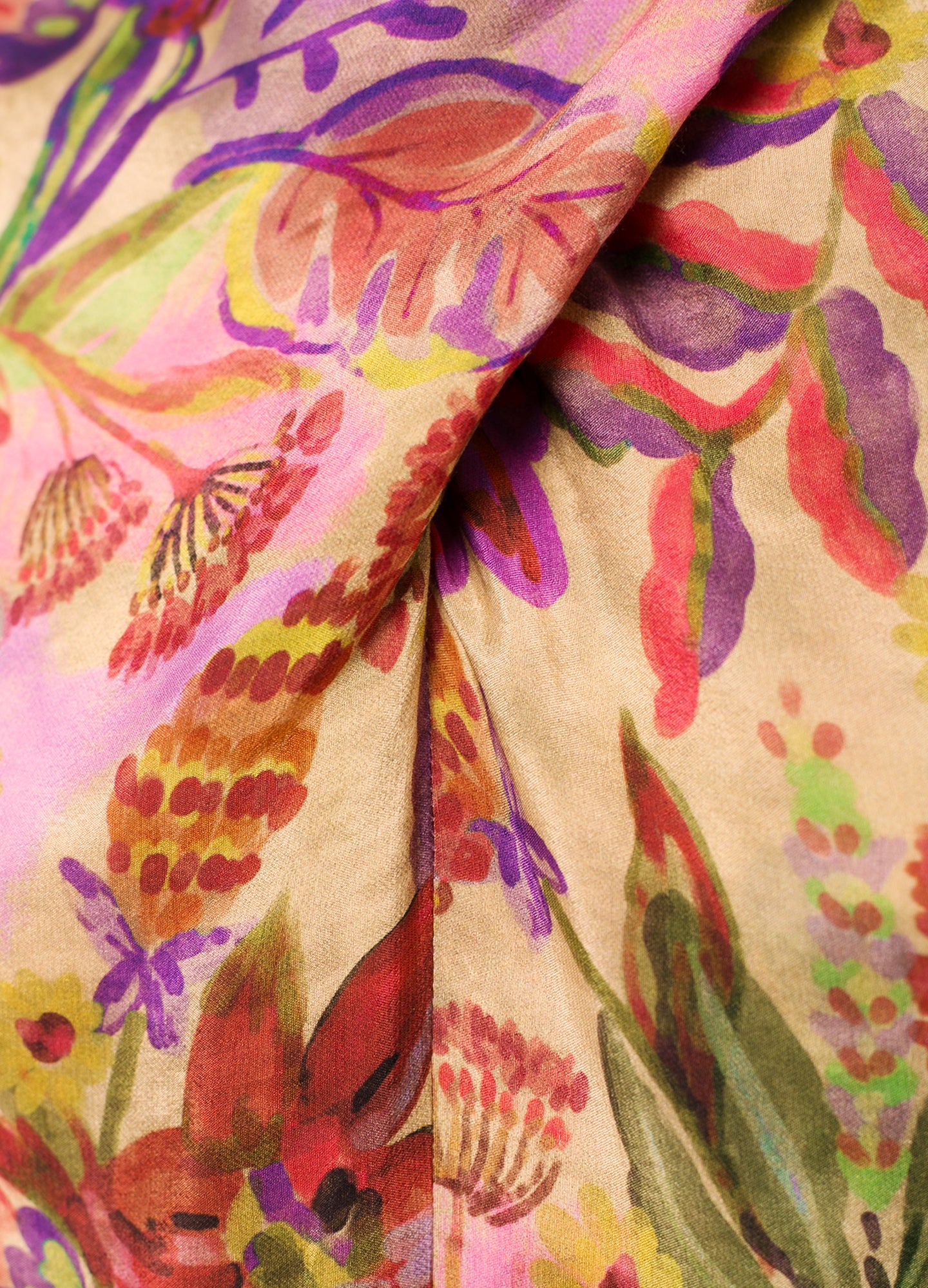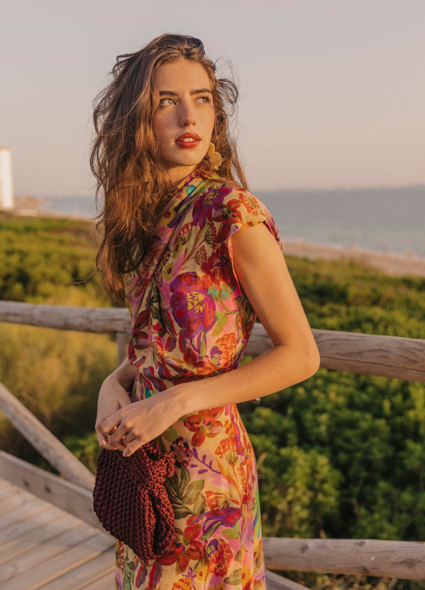 Printed midi dress with a wrap neckline and subtle sheen. Cap sleeves and a draped crossover neckline. Cut at the waist, the flared skirt features an asymmetrical cut at the hips. Back closure with a covered button and invisible zipper. Fully lined.