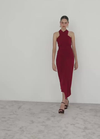 Midi dress in silk knit with draped halter crossover neckline. Detail at the hip with front cuts in multiple directions. Back with wide draped straps and button closure. Rear skirt gathered with invisible zipper up to the waist. Fully lined.