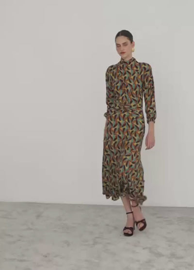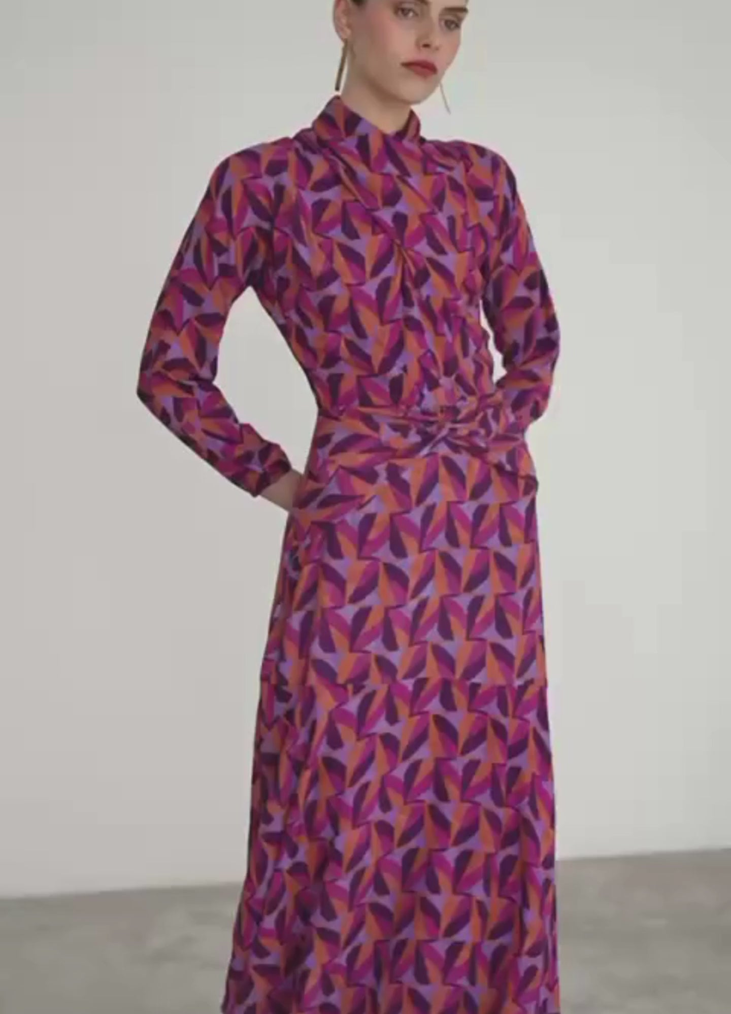 Geometric print midi dress with a wrap neckline that elegantly wraps around the neck. Raglan sleeves and an asymmetrical flared skirt with decorative draping at the hips. Invisible back zipper closure. Fully lined for added comfort.