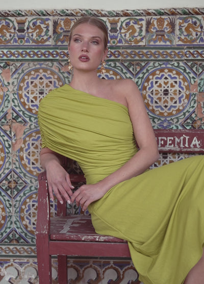 Asymmetrical dress with a cinched waist, one-shoulder neckline, and draped bodice. Flowing A-line skirt. Made from textured silk jersey. Invisible side and back zip fastening. Fully lined.