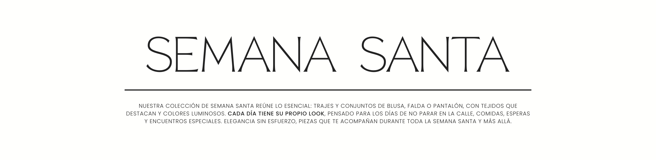 Descubre nuestra colección de Semana Santa con looks que inspiran para cada momento de la celebración. Encuentra trajes elegantes, conjuntos de blusa y falda, y pantalones sofisticados diseñados para combinar estilo y comodidad. Cada día tiene su propio look: desde combinaciones clásicas y atemporales hasta propuestas modernas que marcan tendencia.