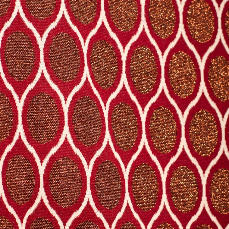 It is a printed blazer jacket with a straight cut, made of jacquard fabric with a geometric print and lurex details. With shoulder pads and a lapel collar with a metal button closure in the center.