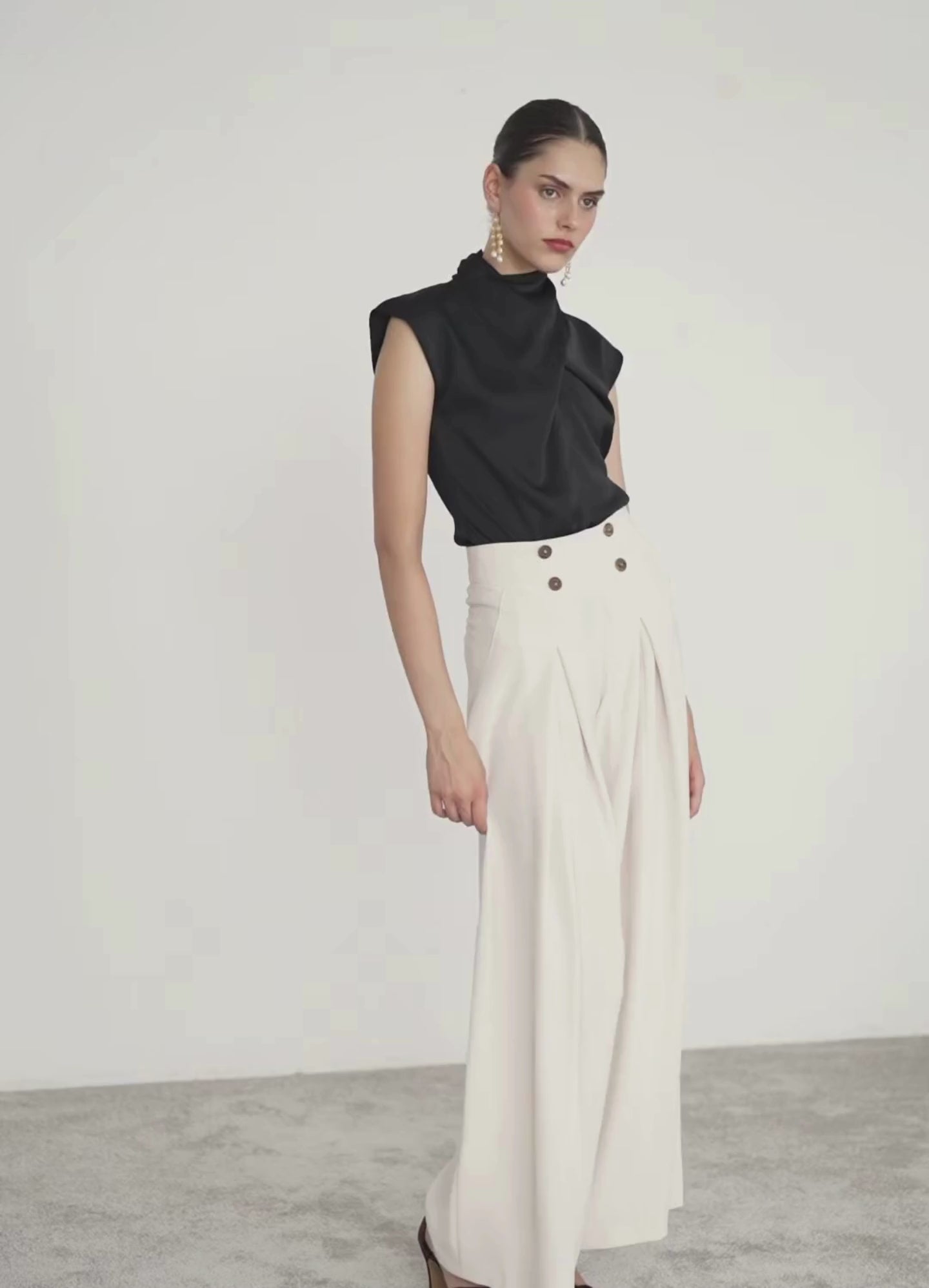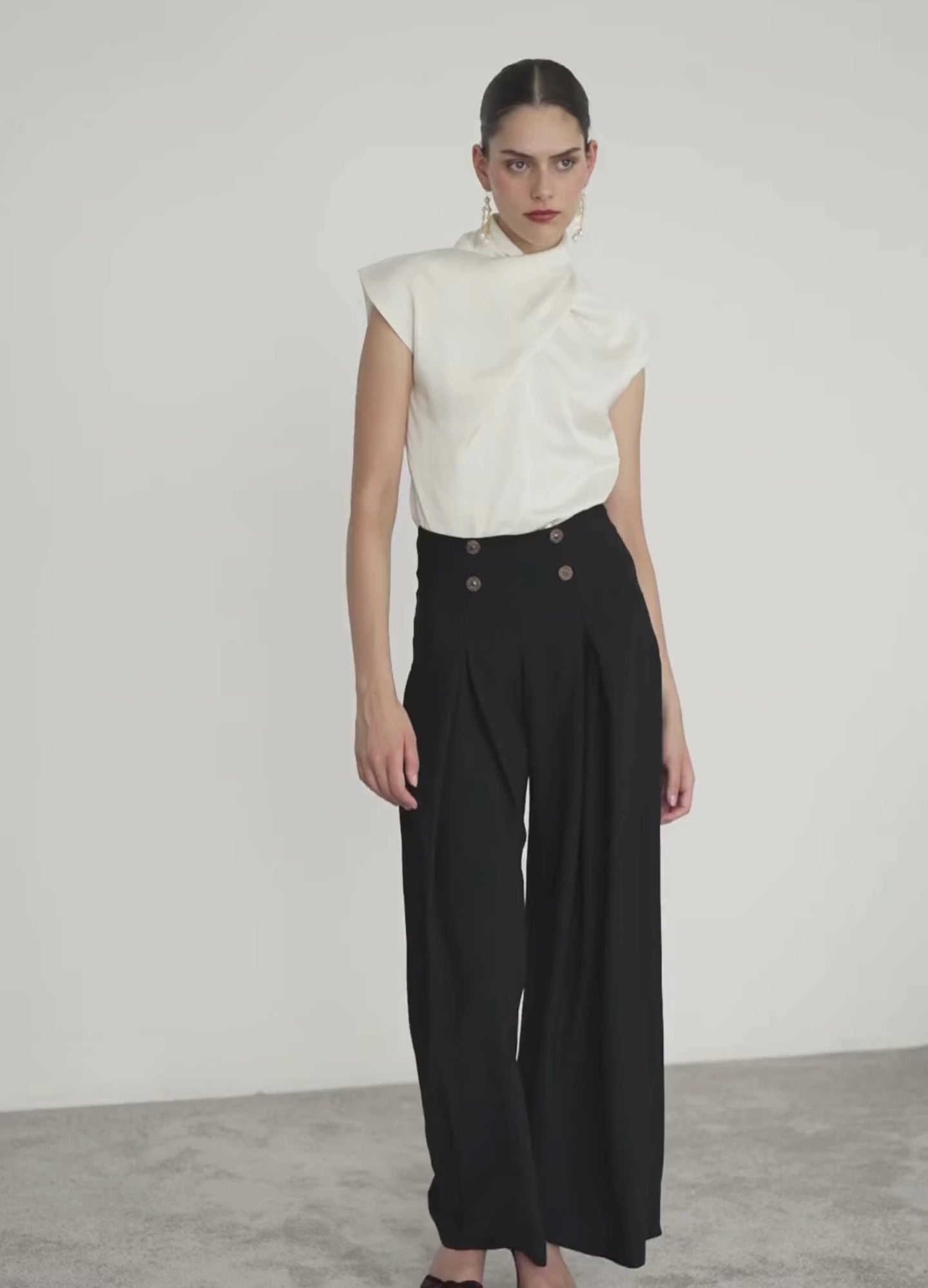 High-waisted, full-length trousers with a fluid cut. Wide-leg design with pleats that add extra volume. Wide waistband decorated with four symmetrical buttons. Invisible side zip fastening.