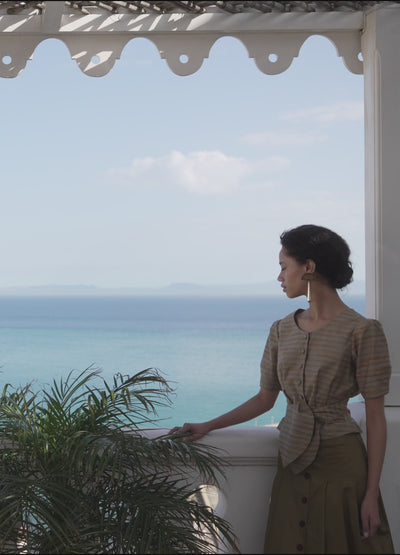 Shirt-style top, made from striped taffeta fabric. It features a fitted silhouette, a rounded neckline, and slightly puffed short sleeves. It incorporates an adjustable front tie that allows you to define the waist and modulate the volume of the garment. Front closure with buttons and tie. Ideal to combine with Riley pants.