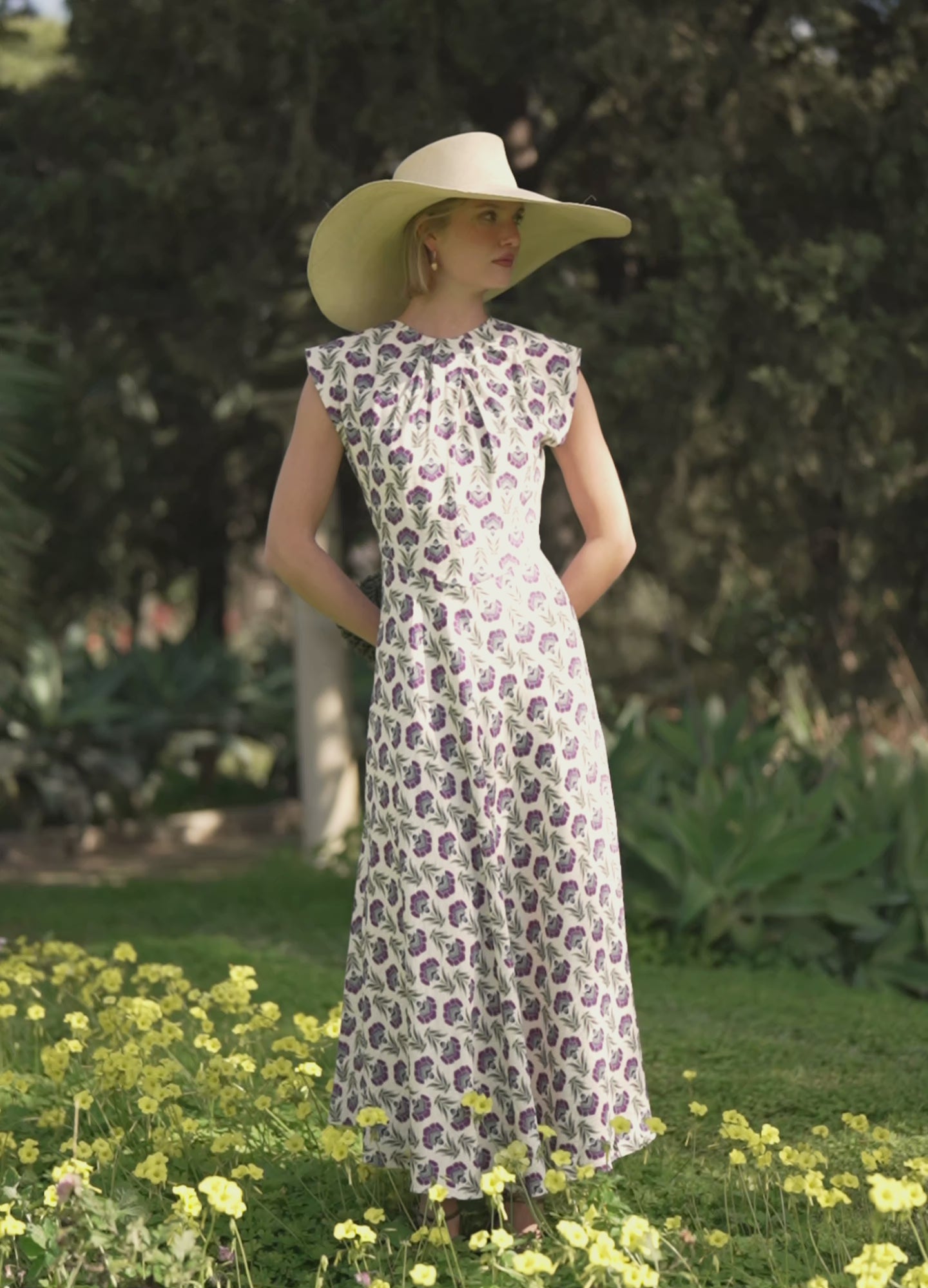 Vestido midi estampado confeccionado en tejido con ligera textura, con escote cerrado y pliegues frontales que realzan los hombros. Cuerpo entallado en la parte superior y falda fluida con caída que aporta movimiento. Cierre con cremallera invisible en la espalda y forro completo.