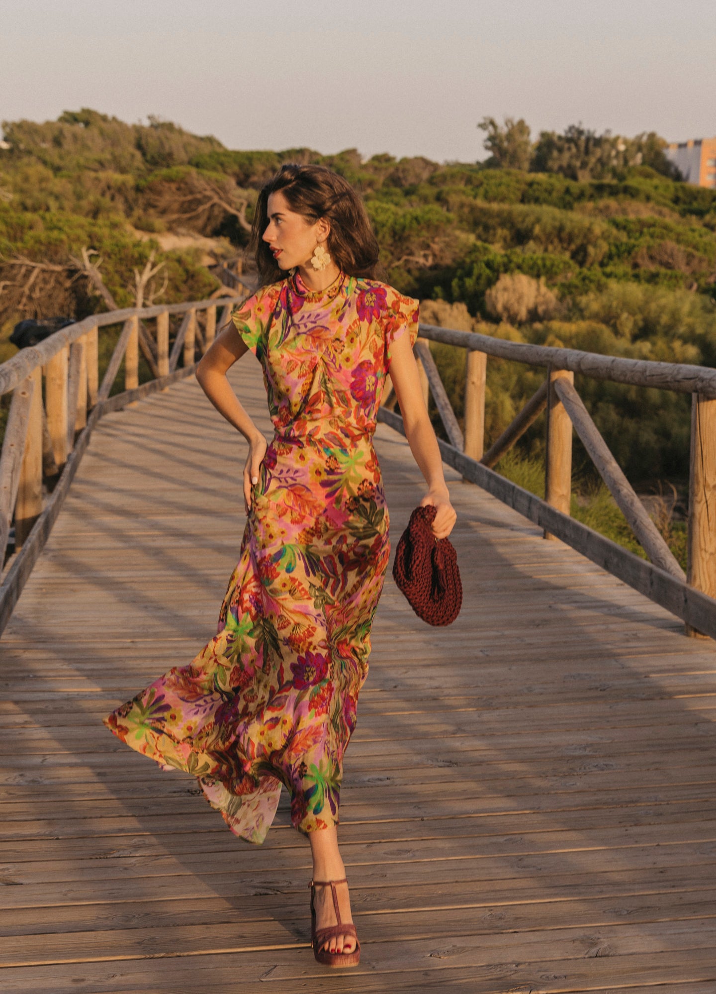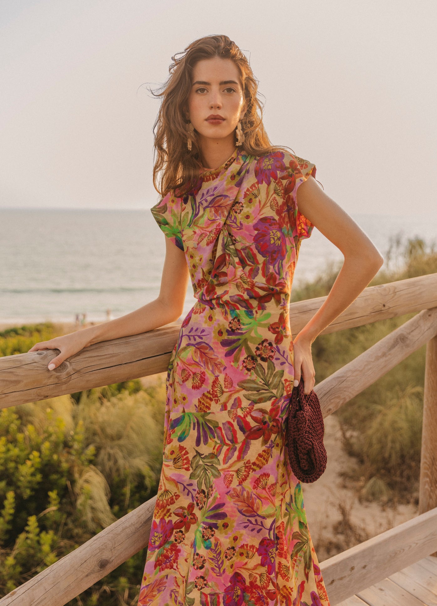 Robe midi imprimée à encolure cache-cœur et subtilement brillante. Manches courtes et encolure croisée drapée. Coupée à la taille, la jupe évasée présente une coupe asymétrique au niveau des hanches. Fermeture au dos par un bouton recouvert et une fermeture éclair invisible. Entièrement doublée.