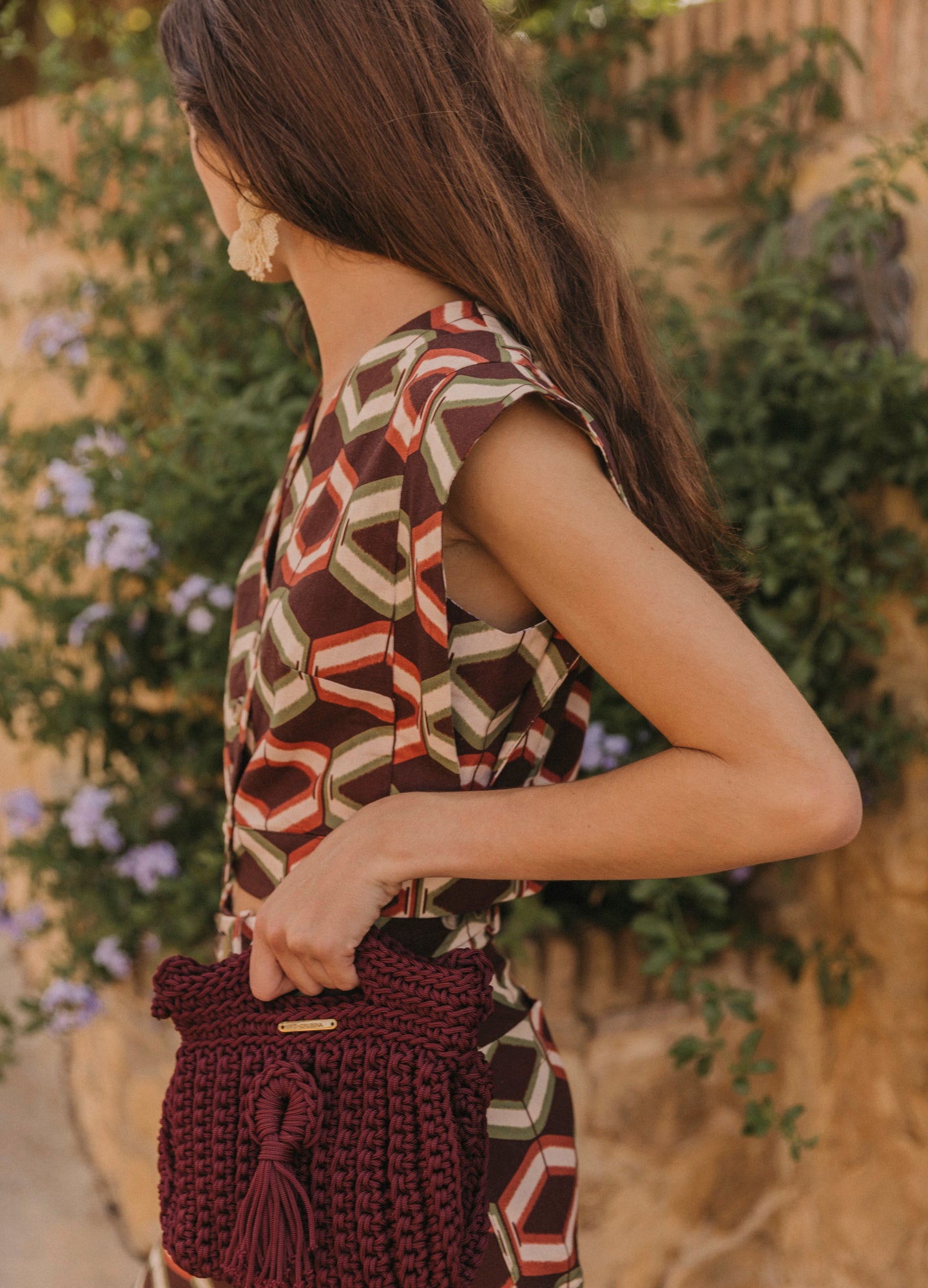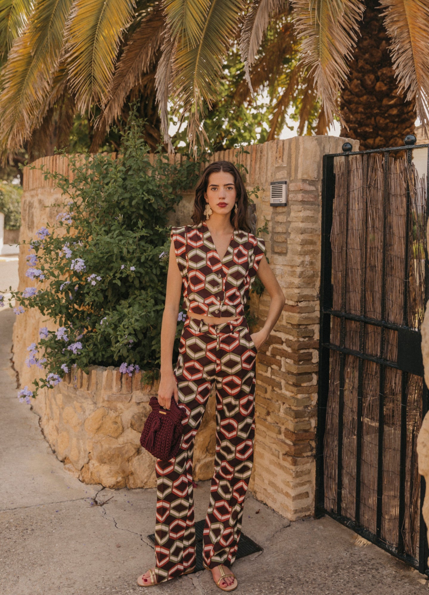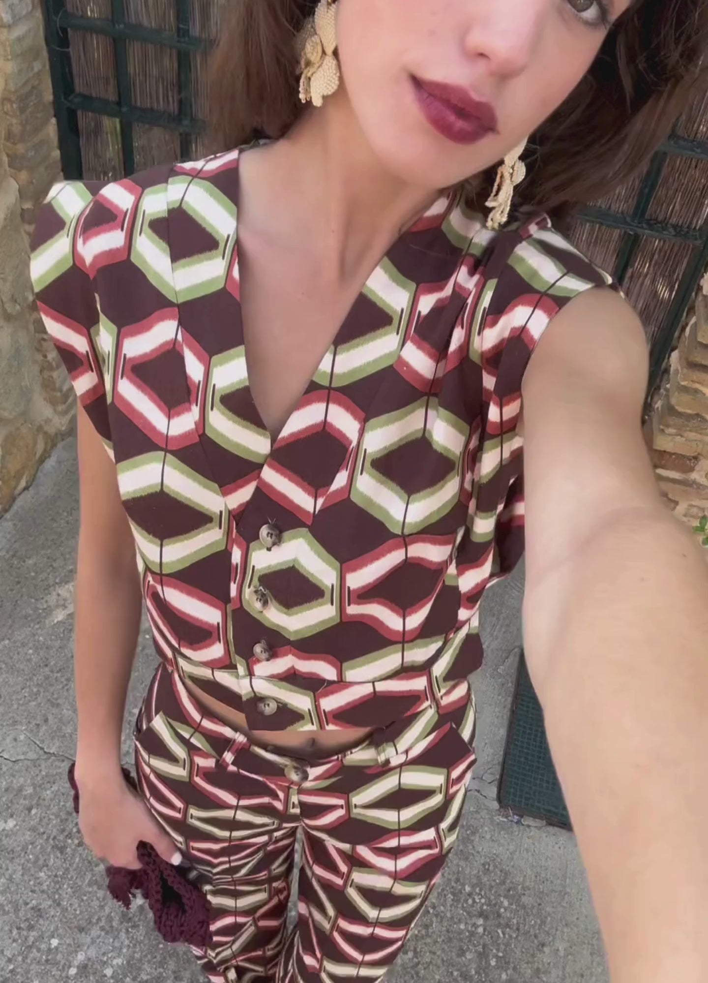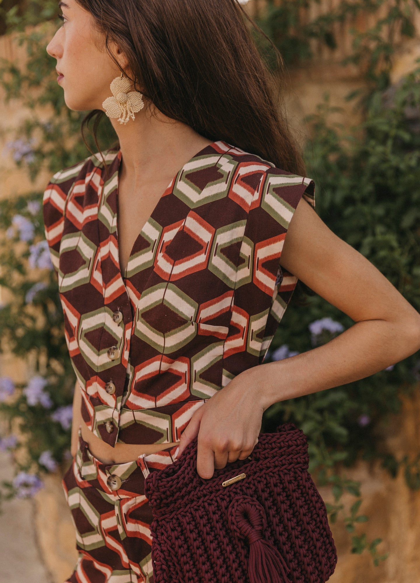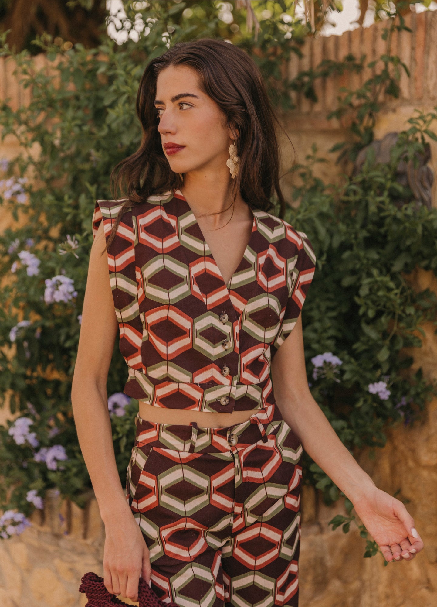 Top corto sin mangas confeccionado en un tejido de lino y algodón con estampado geométrico. Presenta un escote en pico y hombros acentuados mediante una pieza estructurada que se prolonga hasta la cinturilla. Cierre frontal con botones. Forrado en un tejido estampado a tono con el exterior. Combínalo con el pantalón AGUACATE.