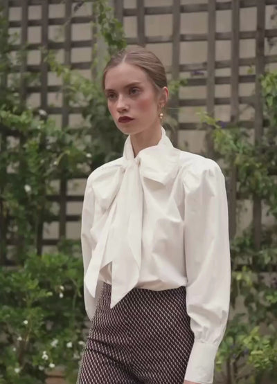 Blusa de corte recto con maxi lazada central y cuello alzado. Manga larga con puños abotonados y cierre frontal con botones.