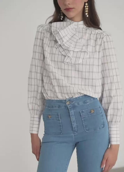 Blusa de cuadros de corte recto con cuello alzado y volante central delantero. Manga larga con puños abotonados en nácar. Cierre trasero con abertura en lágrima y botón.