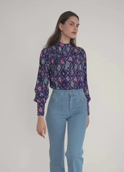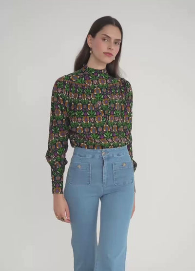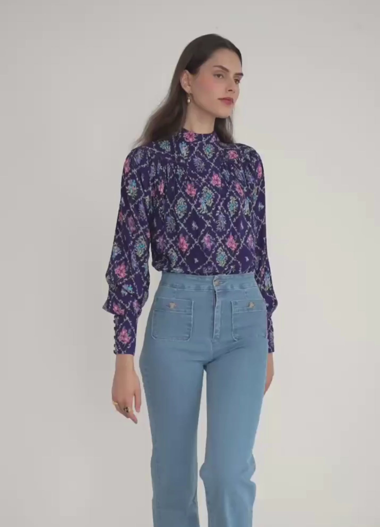 Blusa de vuelo estampada, confeccionada con pieza en los hombros y remates en vivo. Presenta cuello de tirilla abotonado en pico con botones forrados en el lateral izquierdo. Las mangas ranglán tienen vuelo y terminan en puño ancho con cierre de cinco botones.