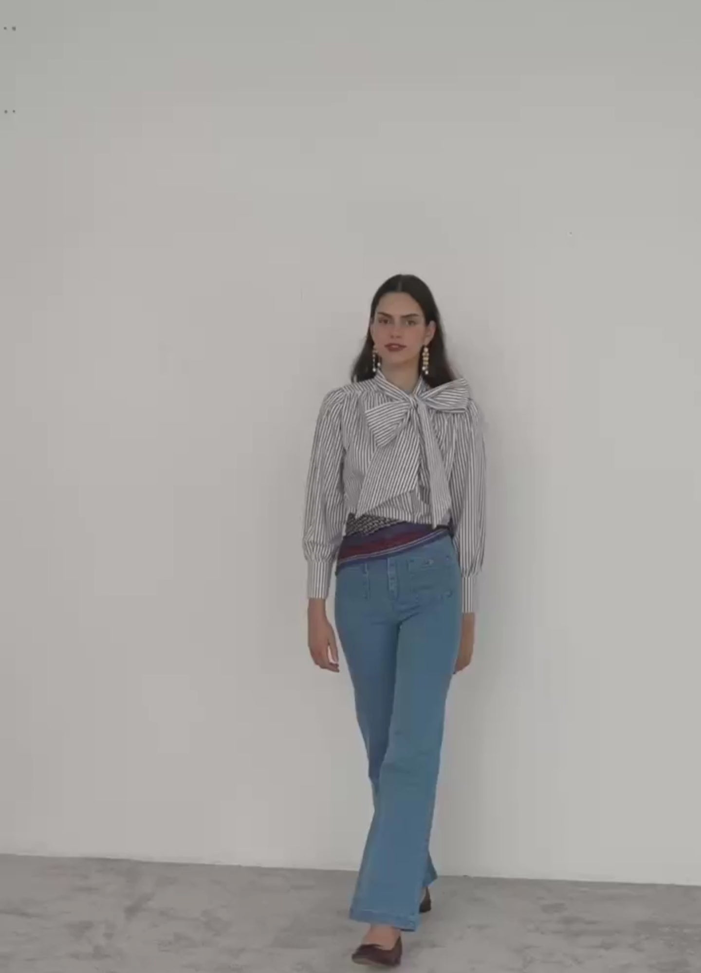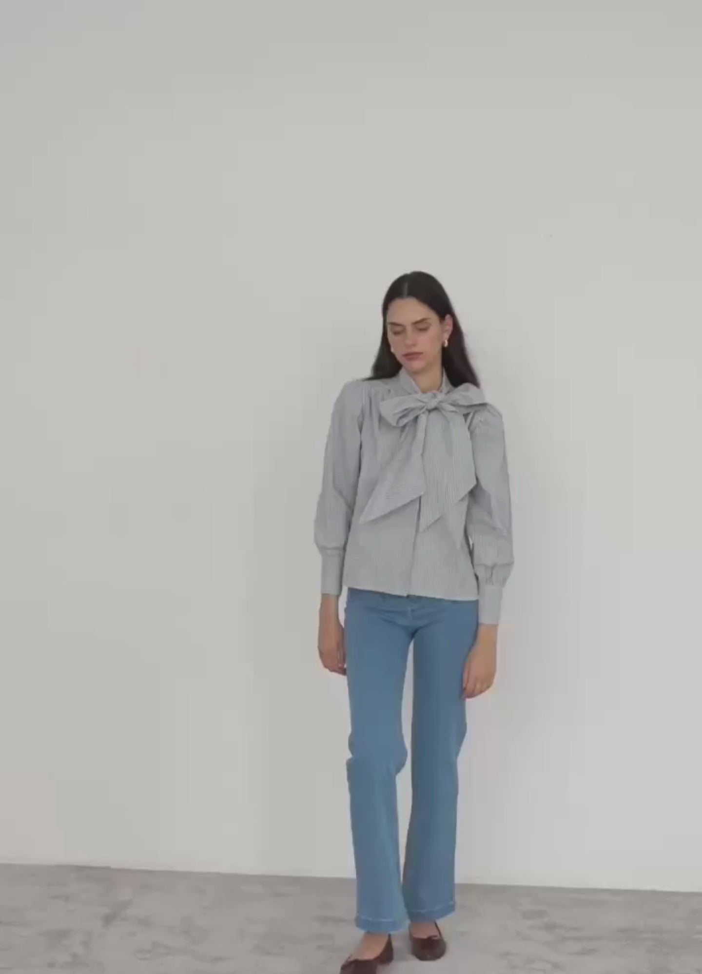 Blusa Oxford de rayas, de corte recto, con maxi lazada central y cuello alzado. Manga larga con puños abotonados y cierre frontal con botones.