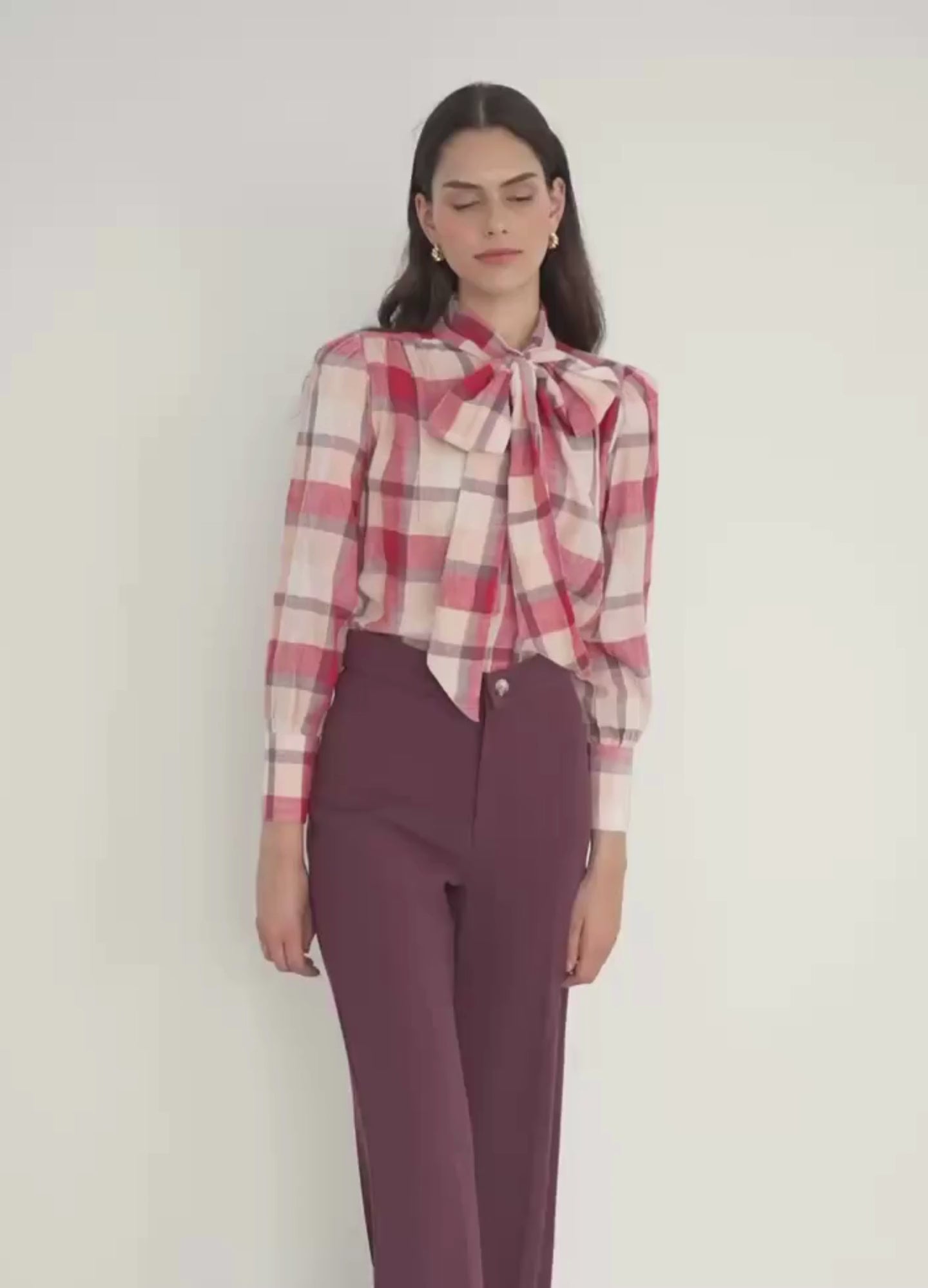Blusa estampada de cuadros de corte recto con maxi lazada central y cuello alzado. Manga larga con puños abotonados y cierre frontal con botones.