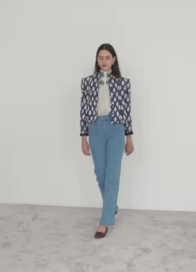 Chaqueta acolchada de corte recto con cuello mao y manga larga. Confeccionada en tejido jacquard artesanal. Abertura frontal con botones, fuelles delanteros y traseros, y mangas oversize con detalle en los hombros.