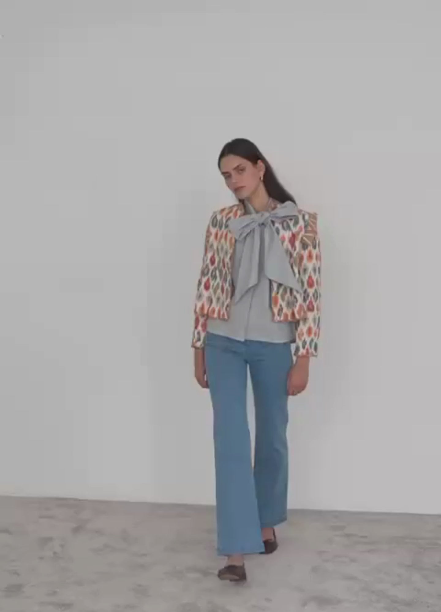 Chaqueta acolchada de corte recto con cuello mao y manga larga. Confeccionada en tejido jacquard artesanal con estampado multicolor. Abertura frontal con botones, fuelles delanteros y traseros, y mangas oversize con detalle en los hombros.