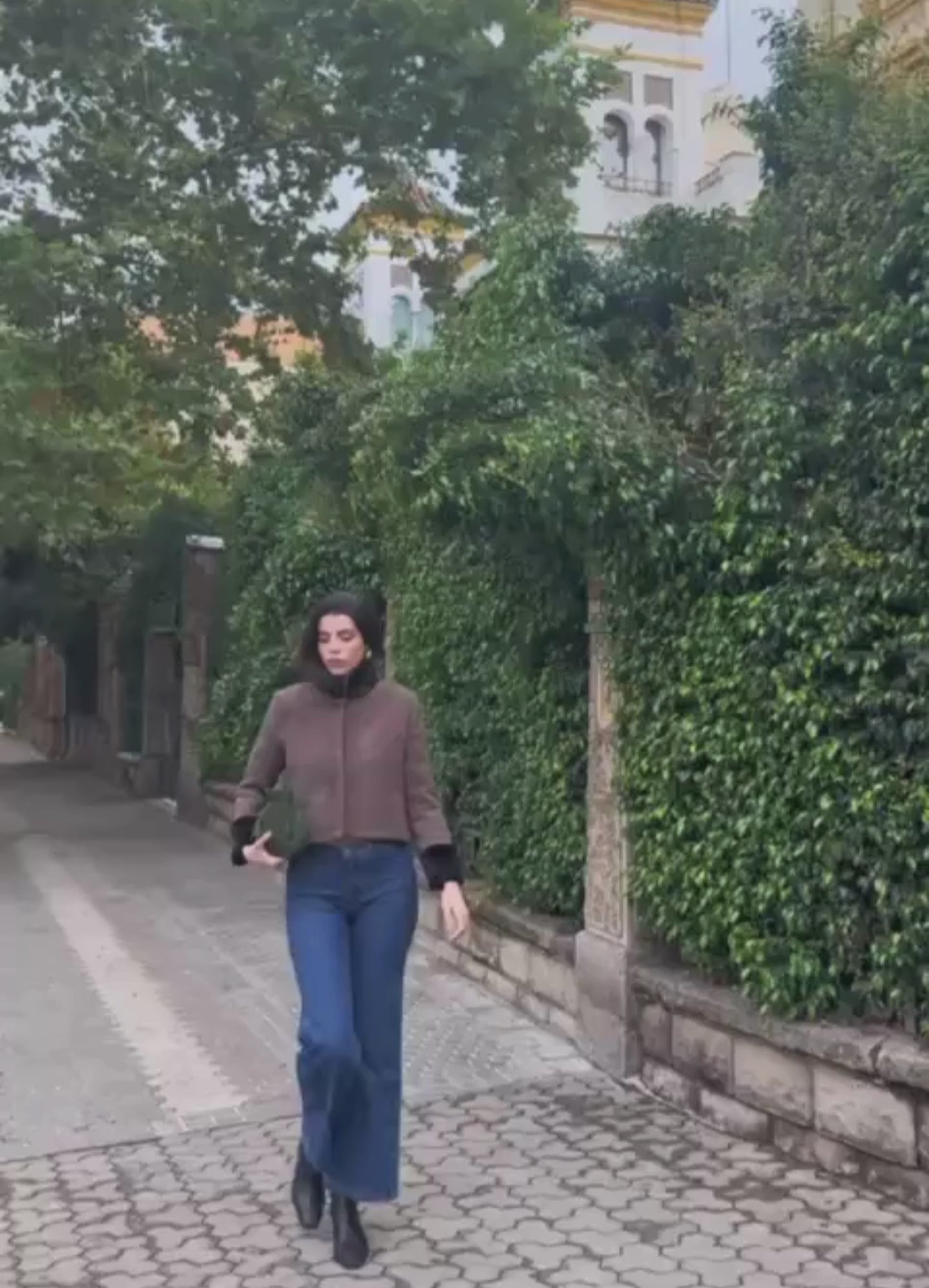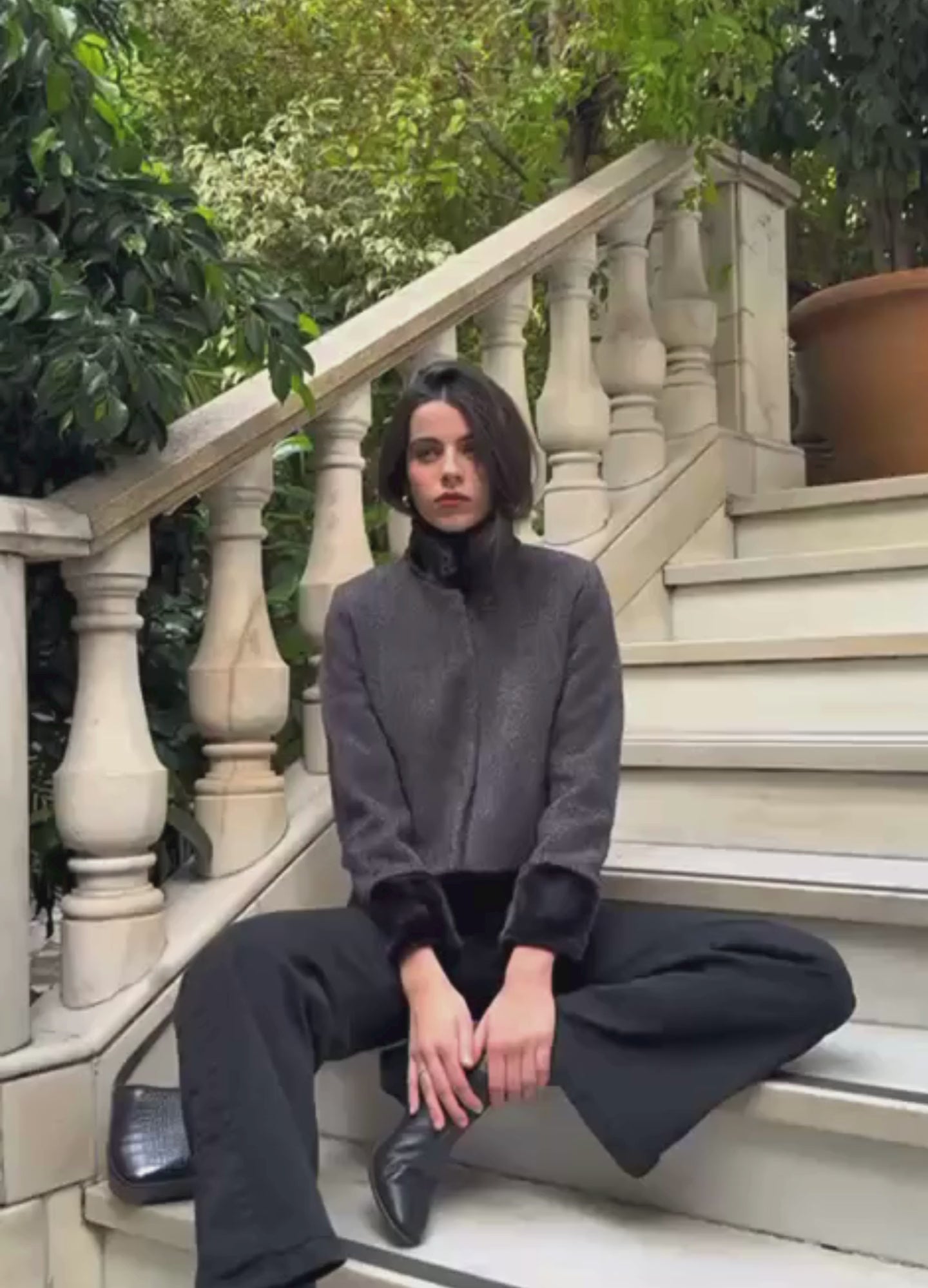 Chaqueta corta de tejido estructurado con efecto afelpado tipo jacquard en dos tonos. Cuello y puños con detalle de pelo, cierre central con botones de presión, bolsillos laterales discretos y forro completo.