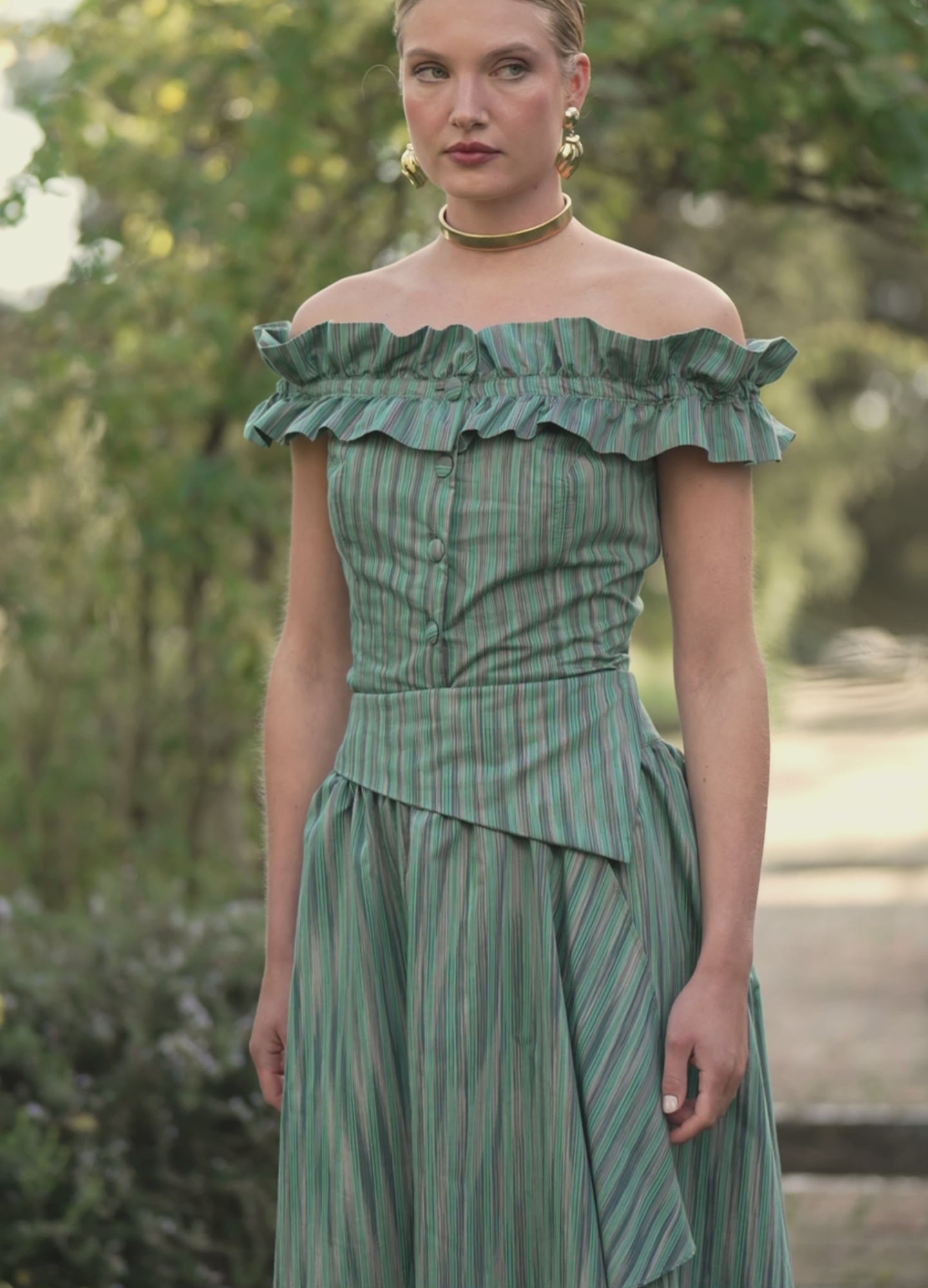 Falda midi de tiro alto con tejido texturizado con rayas finas. Tiene caída fluida con pliegues desde la cintura y un panel delantero superpuesto con drapeado asimétrico. Cinturilla ancha y cierre con cremallera invisible. Perfecta para combinar con el top Celina.