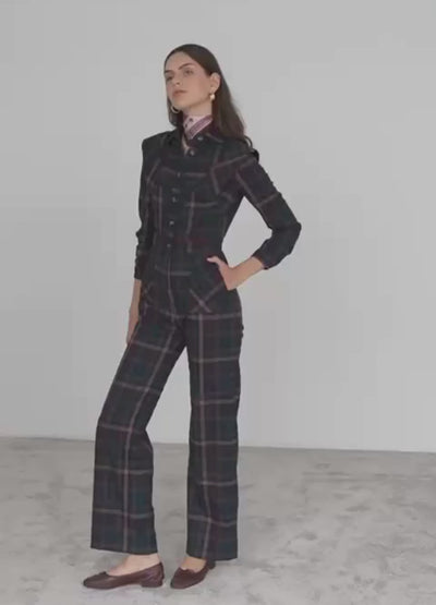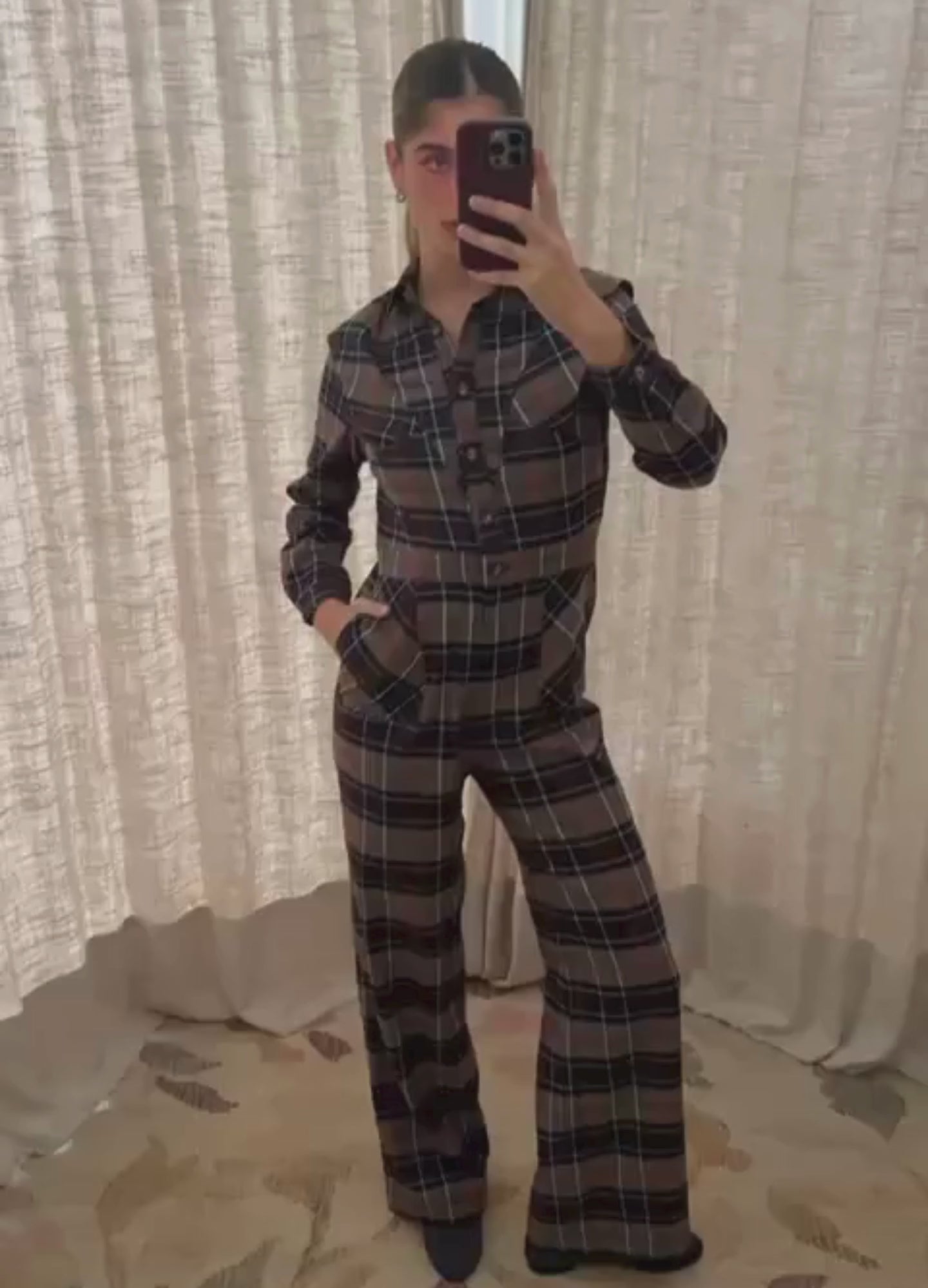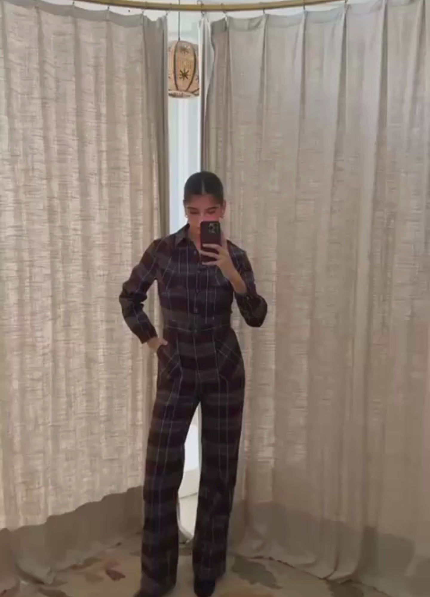 Mono largo estampado de corte recto con cierre frontal de botones. Cuello camisero y manga larga con puño. Detalle de pieza geométrica en los hombros, bolsillos delanteros y cinturilla.