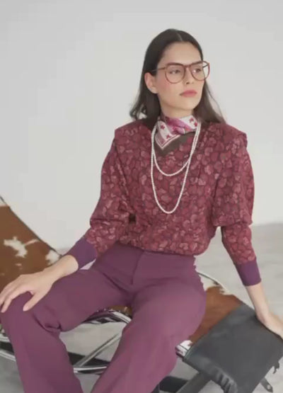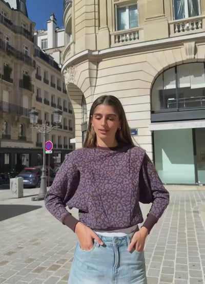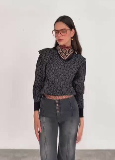 Sudadera de corte geométrico en tejido jacquard de leopardo con lurex. Presenta cuello a la caja, hombros estructurados y mangas largas abullonadas con puños elásticos. El bajo también termina en punto elástico. Logo bordado en la espalda. Diseño exclusivo de Cherubina.