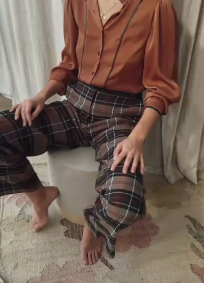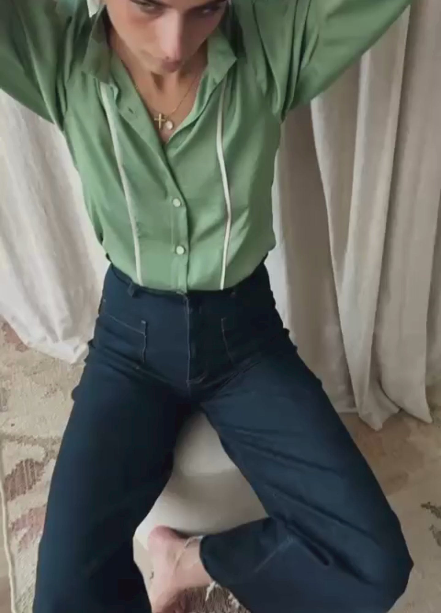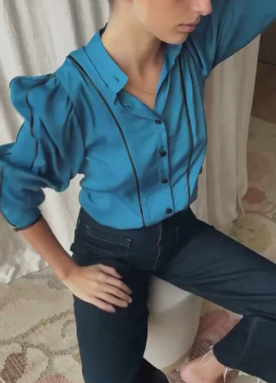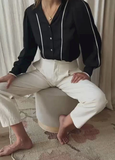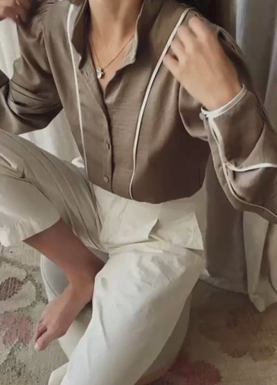 Camisa de manga larga con cuello mao y abertura frontal con botones. Los cortes del cuerpo y los puños presentan vivos contrastados, con cierre de botón en las mangas. Confeccionada en tejido satinado.