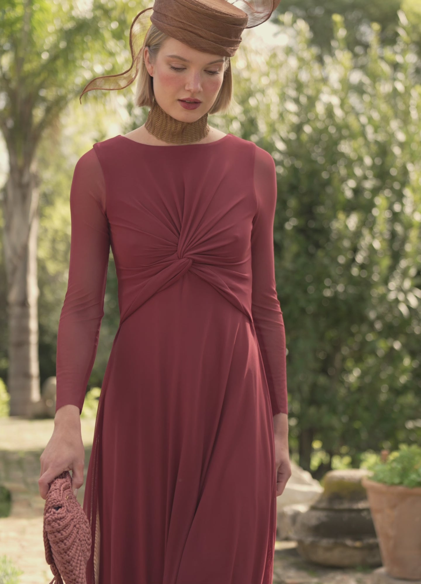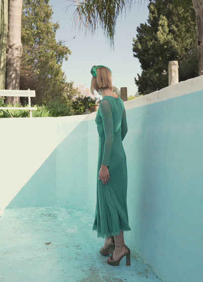 Vestido largo de tul con cuello caja amplio y nudo central en el cuerpo. Falda evasé con vuelo que aporta fluidez. Cierre trasero en forma de lágrima con botón. Prenda totalmente forrada.