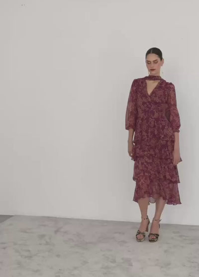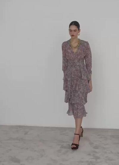 Vestido midi de gasa estampada con manga larga y escote en uve. Corte definido en la cintura y falda completa de volantes en capa. Incluye foulard versátil para usar en el cuello o la cintura. Totalmente forrado para mayor comodidad.