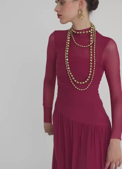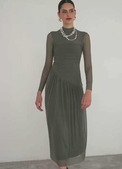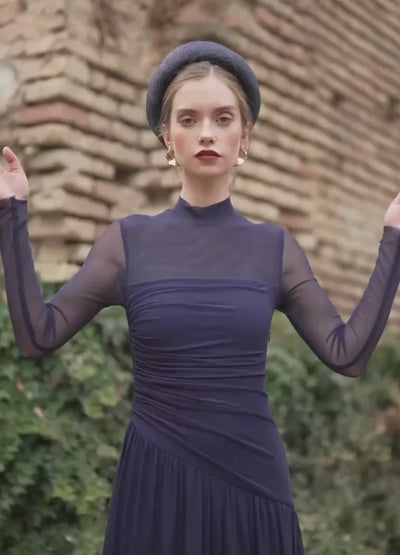 Vestido midi confeccionado en tul elástico fino. Manga larga y falda evasé con movimiento. Escote ilusión con cuello caja ligeramente subido y cuerpo interior palabra de honor. Forro completo en cuerpo y falda. Cierre trasero con detalle en lágrima para un toque sofisticado.