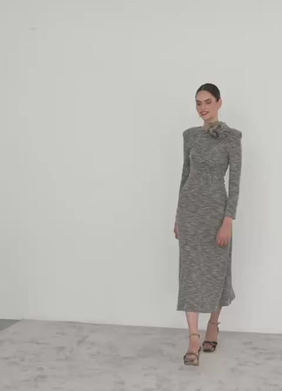 Vestido midi de cuello a la caja y manga larga. El cuerpo ajustado presenta un drapeado lateral y corte en la cintura. La falda es evasé y cuenta con cierre trasero de cremallera invisible. Confeccionado en tweed denim elástico que se adapta al cuerpo. Totalmente forrado.