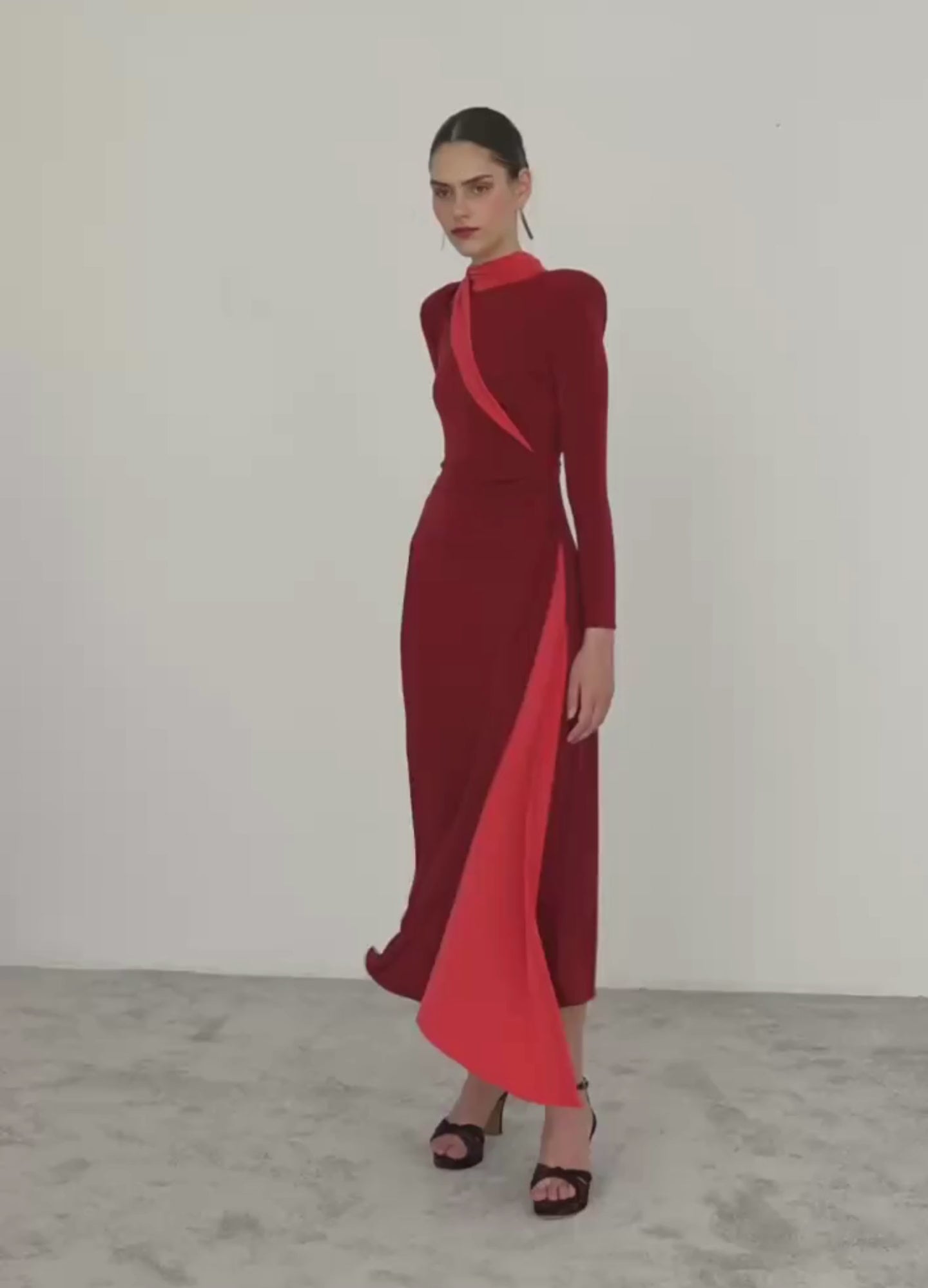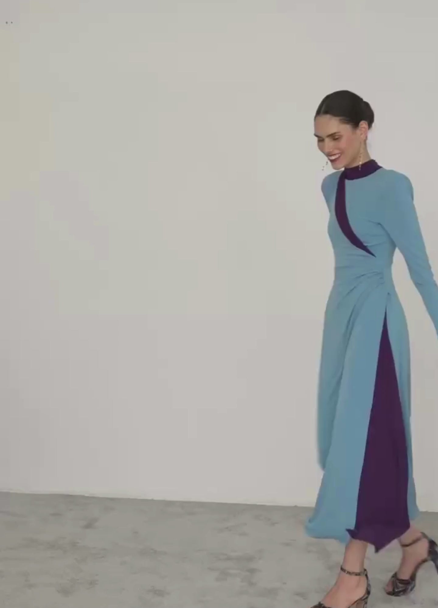 Vestido midi de manga larga confeccionado en punto de seda bicolor. Con cuello a la caja, ligeramente subido con un efecto pañuelo que cruza el pecho y se extiende hasta uno de los lados. Falda de vuelo con una abertura lateral y efecto envolvente, con un sutil drapeado en la cadera. Cierre cremallera invisible en la espalda.