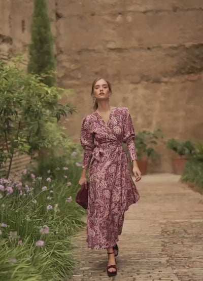 Vestido midi de corte envolvente con estampado exclusivo. Escote en V y pliegue en el hombro. Mangas con vuelo y puño ancho con cierre de cremallera invisible. Falda evasé con volante de capa. Incluye cinturón en el mismo tejido. Prenda totalmente forrada.