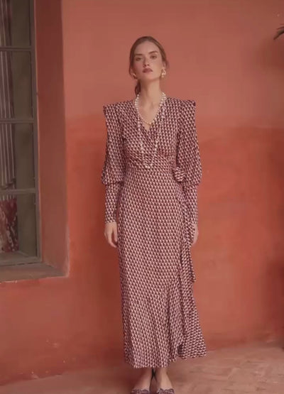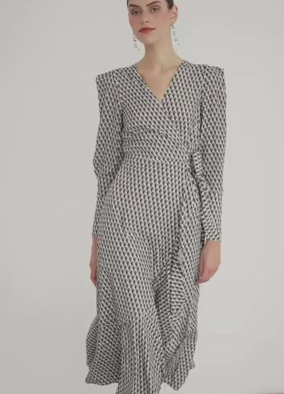 Vestido midi de corte envolvente con estampado geométrico. Escote en V y pliegue en el hombro. Mangas con vuelo y puño ancho con cierre de cremallera invisible. Falda evasé con volante de capa. Incluye cinturón en el mismo tejido. Prenda totalmente forrada.