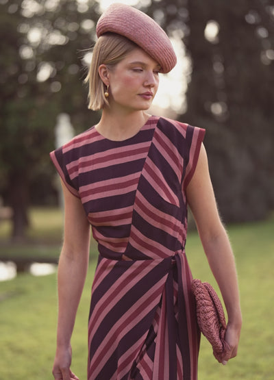 Vestido midi de cuello caja con rayas en distintas direcciones. Falda envolvente, manga caída y cintura definida con lazada lateral. Espalda con botones y discretas aberturas. Diseño elegante y favorecedor, perfecto para eventos y ocasiones especiales.