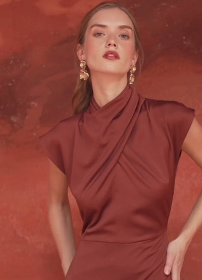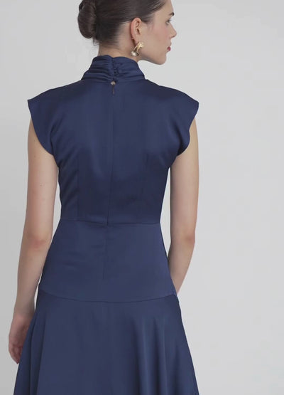 Vestido midi con escote envolvente, manga japonesa y cuello cruzado con drapeado. Corte a la cintura y falda evasé con corte asimétrico a la cadera. Cierre trasero con cremallera invisible y botón forrado. Confeccionado en tejido ligeramente satinado. Totalmente forrado.